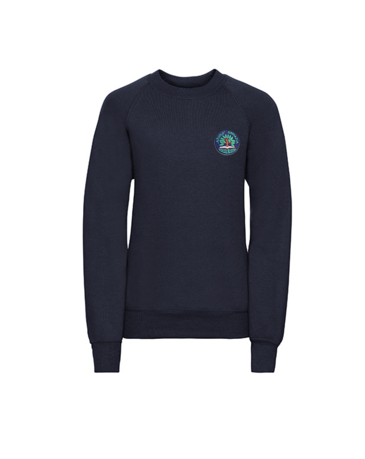 Trikotažinis sportinio tipo džemperis be gobtuvo su mokyklos emblema